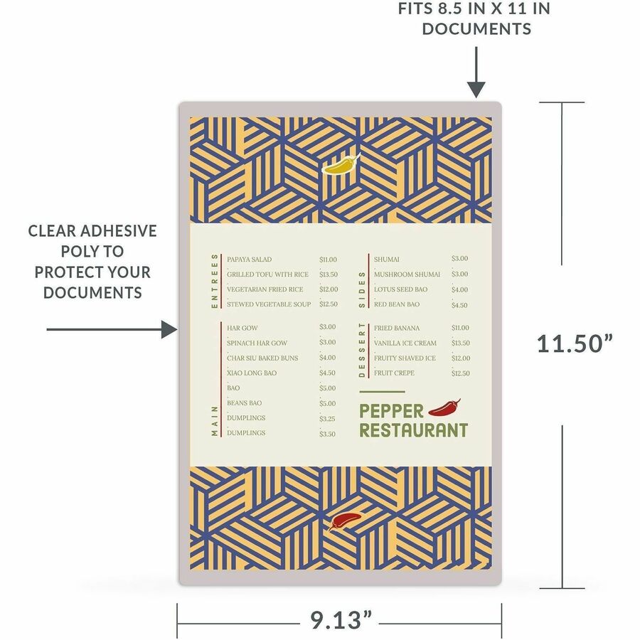 | Marketing Information | Quickly turn any letter-size paper into a professional-looking document with these laminating pockets. Place your 8-1/2" x 11" document inside folder, remove protective the liner and seal. Ideal for phone lists, certificates, instructions, signs and almost anything else. No cutting, measuring, heat or special equipment needed. Heavyweight laminating pockets offer a super strong construction. |
