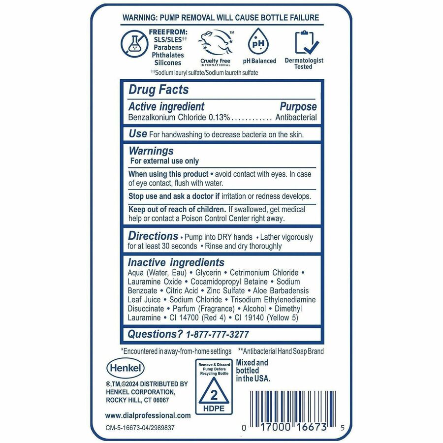 | Marketing Information | Original Antibacterial Foaming Handwash Refill kills 99.99 percent of germs encountered in away-from-home settings and is especially designed for the Dial FIT Universal Touch-free Dispenser. Its hypoallergenic foam is as mild as water itself and gentle on skin. Enriched with a triple-moisturizing system, this nondrying, antibacterial formula helps condition hands. It is specially formulated for frequent handwashing. Clean Tip Technology cleans the pump tip after each use to minimize drip risk. |