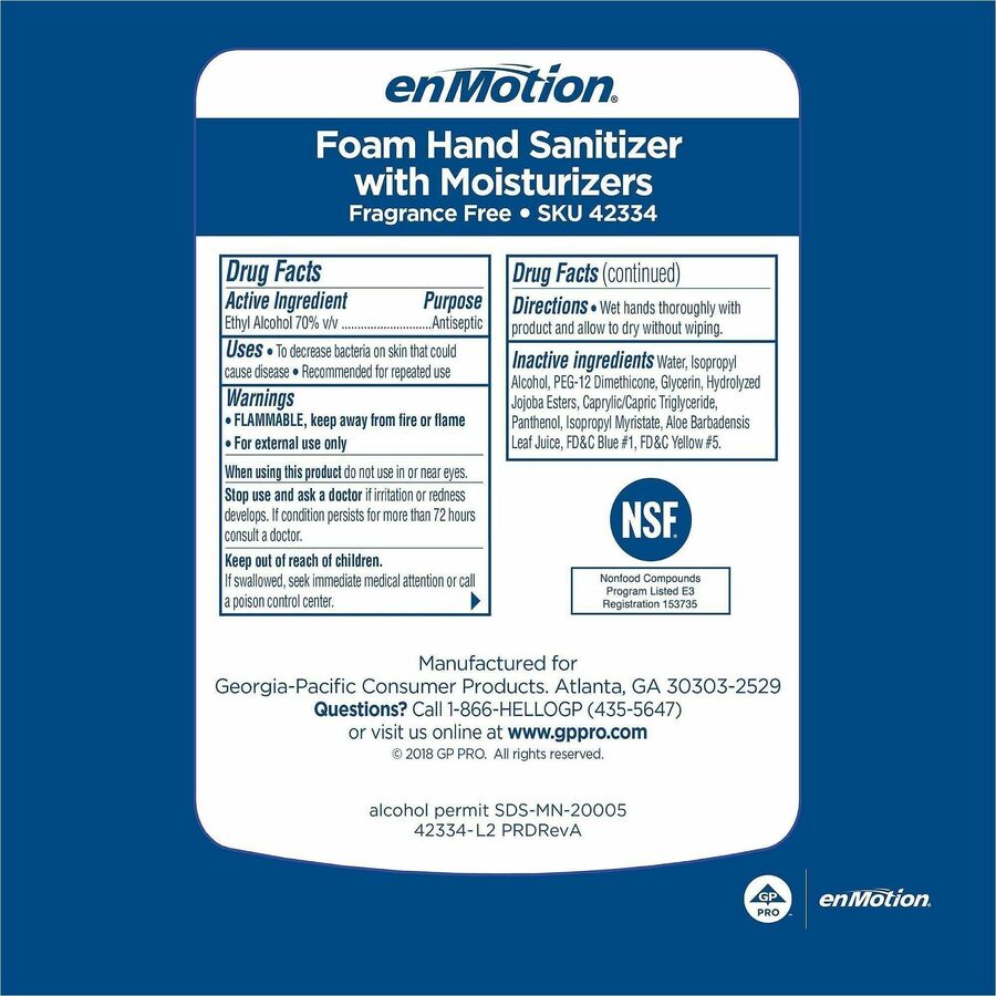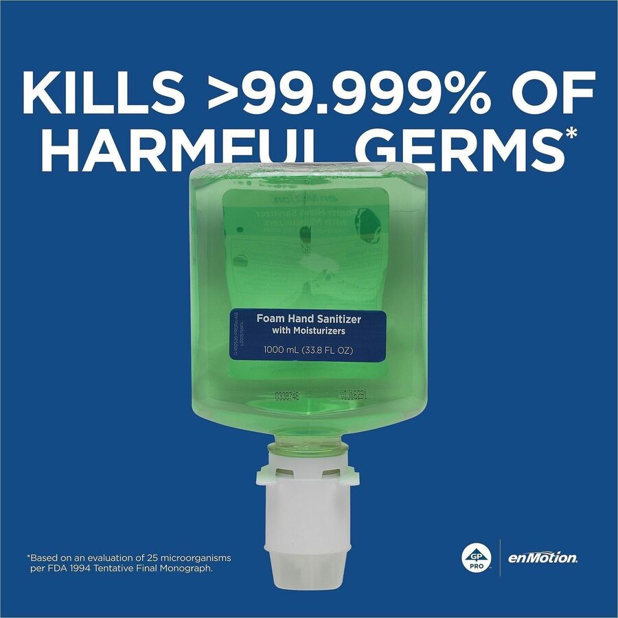| Marketing Information | Gentle on hands, tough on bacteria - enMotion® Gen 2 Foam Hand Sanitizer kills 99.99% of common germs that may cause illness. Safe for use in food processing and food service areas after proper hand washing. Formulated to dry quickly. |