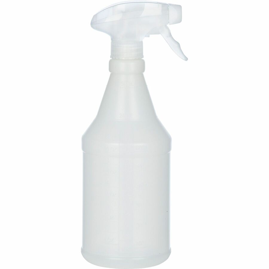 Empty, plastic spray bottle features a trigger-type atomizer cap and flexible plastic tube that is ideal for dispensing cleaners. Chemical-resistant trigger sprayer is adjustable. Bottle is marked with ounce gradations. |